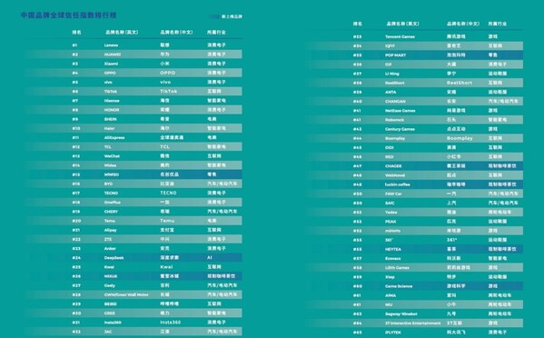 与2024年相比,2025年中国品牌全球信任指数排行榜的前6名排位格局保持稳定,各品牌信任指数无明显变化;