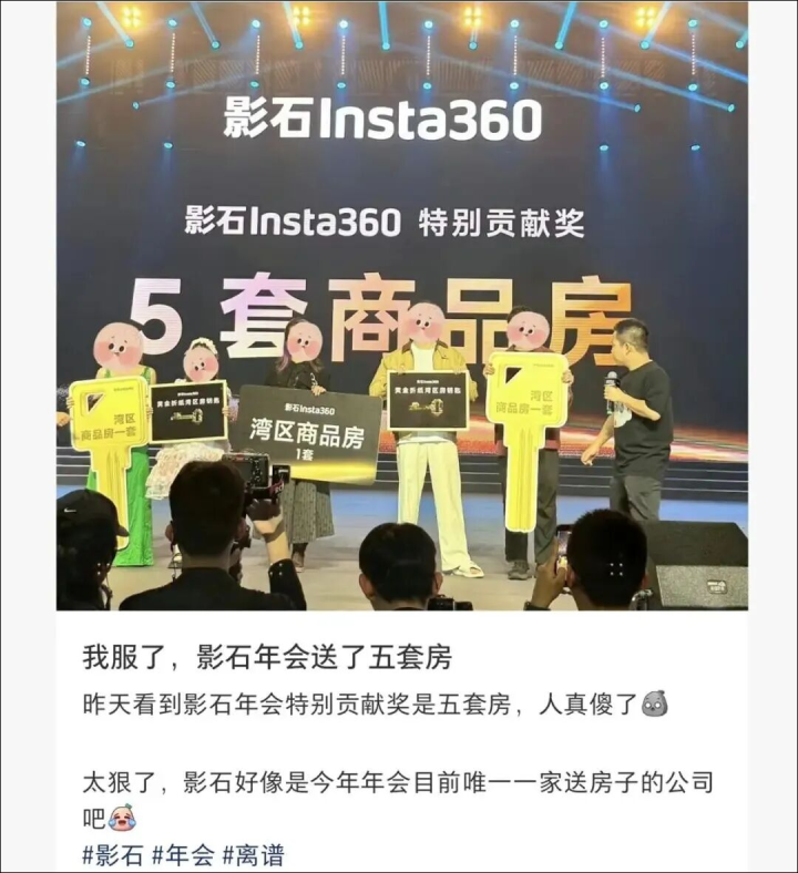 2月11日,影石Insta360举办年会,其中,最重磅的特别贡献奖是5套大湾区商品房,均由90后获得。据极目新闻,记者从影石方面获悉,现场还有保时捷、特斯拉、理想、宝马等名车相送。